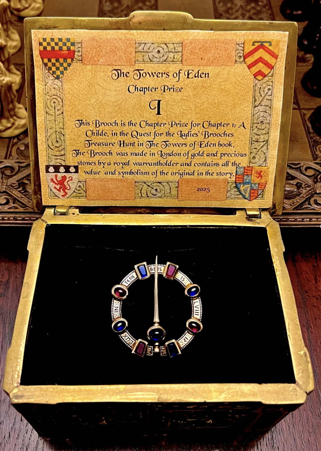 Each brooch will be presented in a genuine antique (19th Century) brass casket modelled on a medieval original and refurbished by Merliz (see team credits) especially for The Towers of Eden. Inside each casket will be a certificate of authenticity.