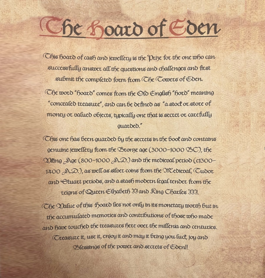 The Hoard of Eden is a true hoard consisting of real jewellery from the past, as well as a golden Lady’s brooch, genuine silver hoards of coins from the medieval, Tudor and Stuart times and thousands of pounds of Charles III and Elizabeth II £1 and £2 legal tender. The hoard is all contained in an 18th century Presentation Case. Win it by answering the questions in the book and completing the entry form in the back of the book.