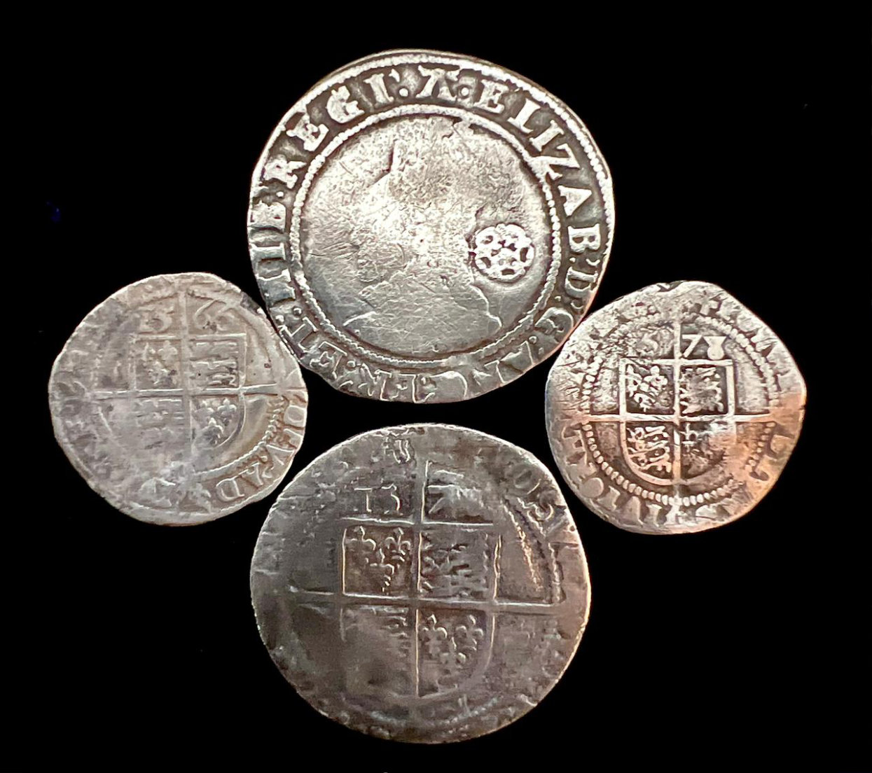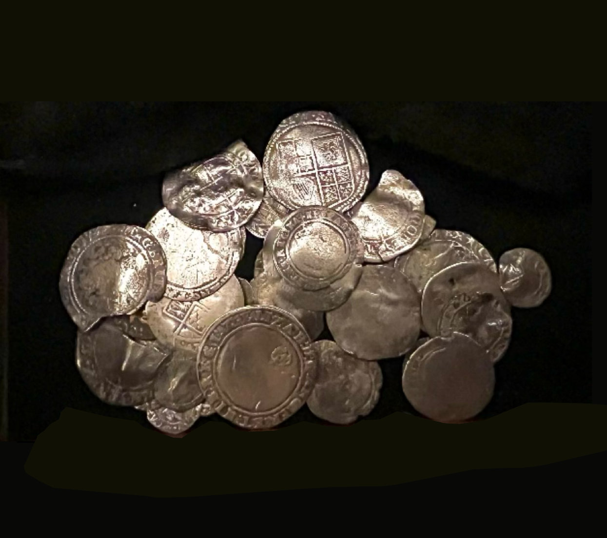 Two separate pouches of ancient silver coins are included in The Hoard of Eden. The first contains largely medieval silver coins from a number of sources and including pennies, groats and other denominations, and the second consists of silver coins from the Tudor or Stuart period, also consisting of groats, pennies and other denominations. Many of the coins are clipped or very worn, showing their long use (clipping was the illegal practice of cutting silver from the edges of coins), but enough details can still be seen to identify most of them.