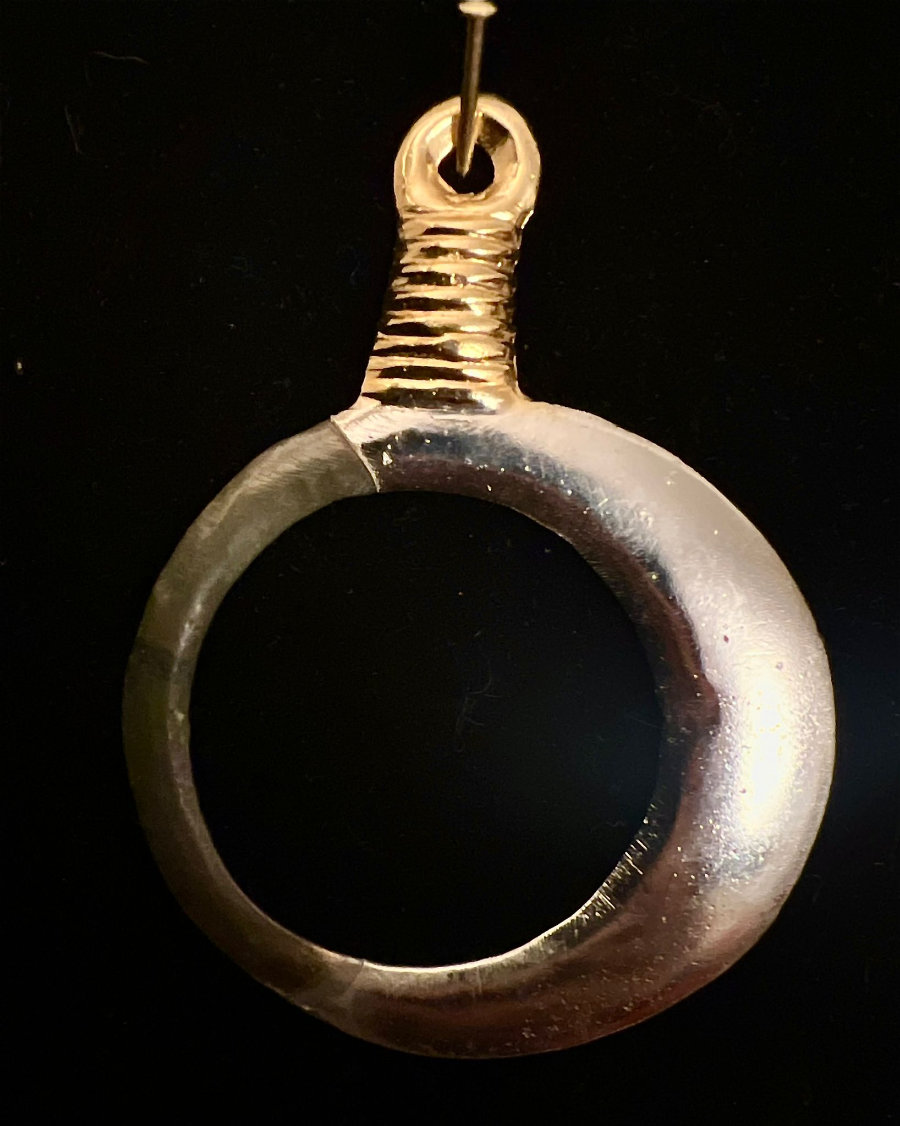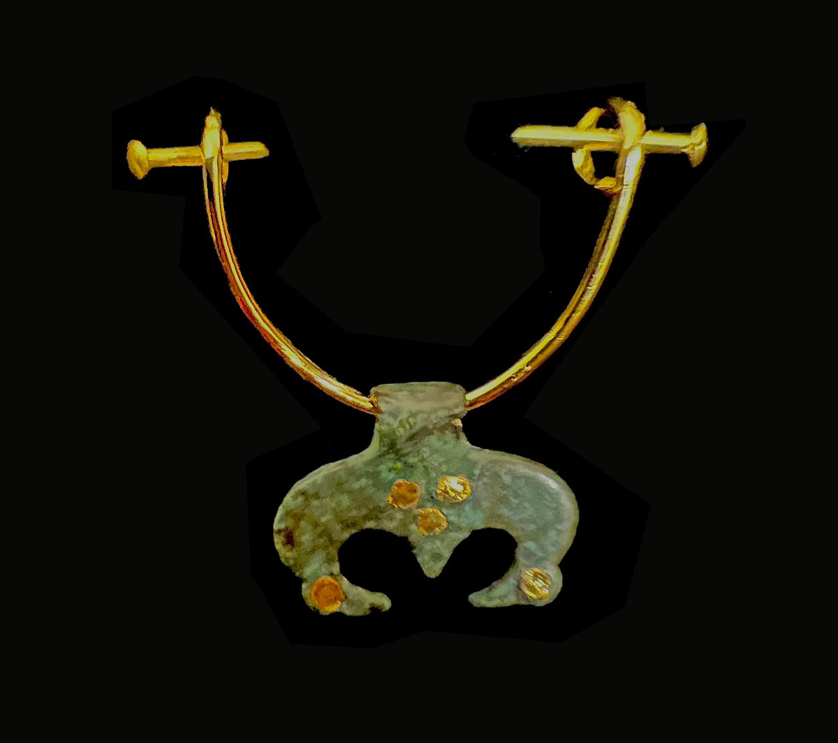 A Bronze Age pendant dating from 2nd to early 1st Millennium B.C. from a German collection, freshly gilded in part. Would have been worn by a Priestess of the Moon Goddess/lunar cult.