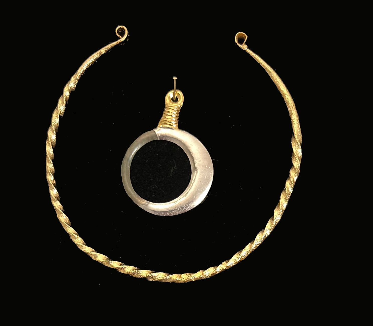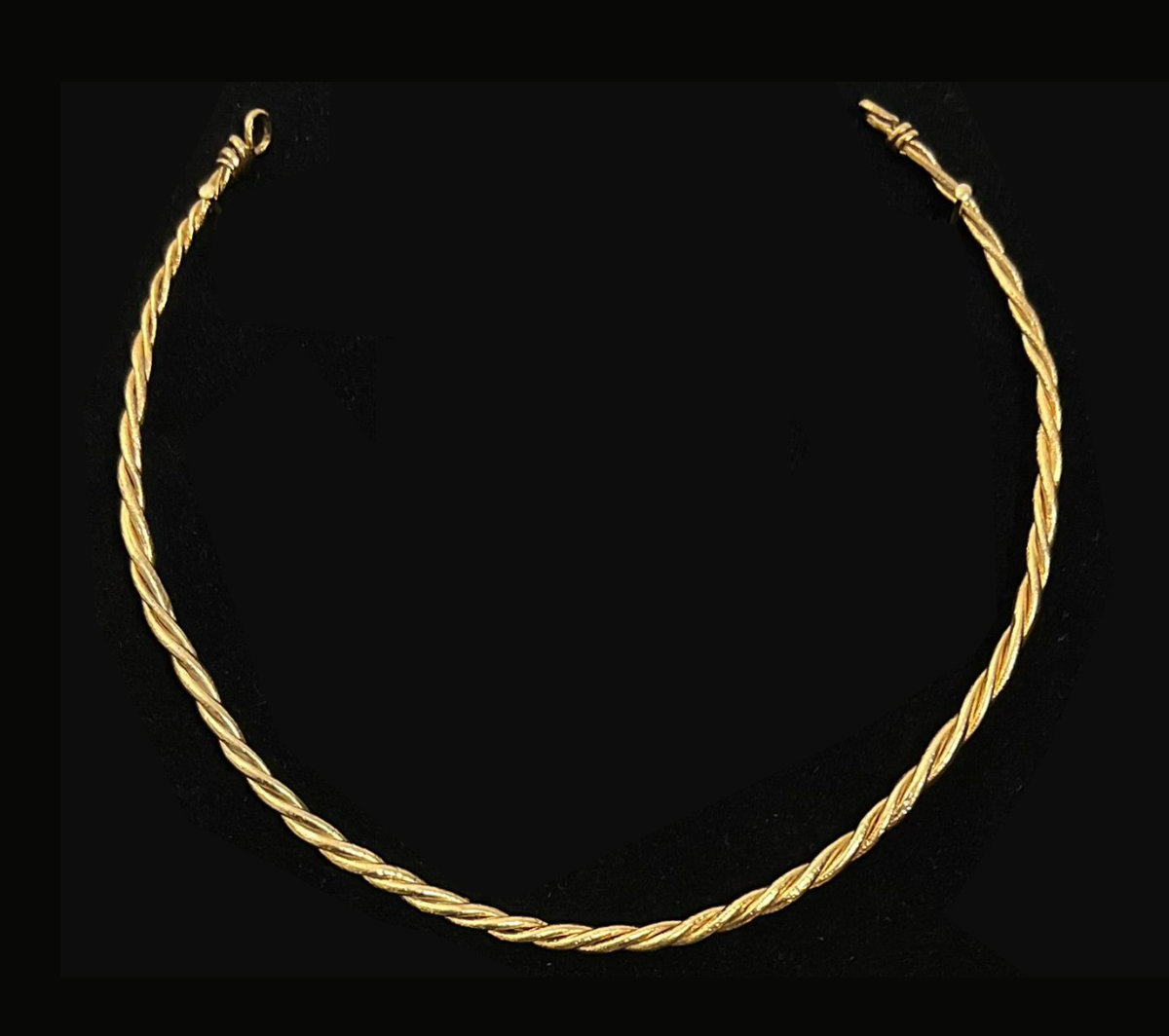 A Bronze Age torc dating from between 2nd and 1st Millennium B.C. from a German collection, freshly gilded. Would have been worn as decorative jewellery by women in the Bronze Age.